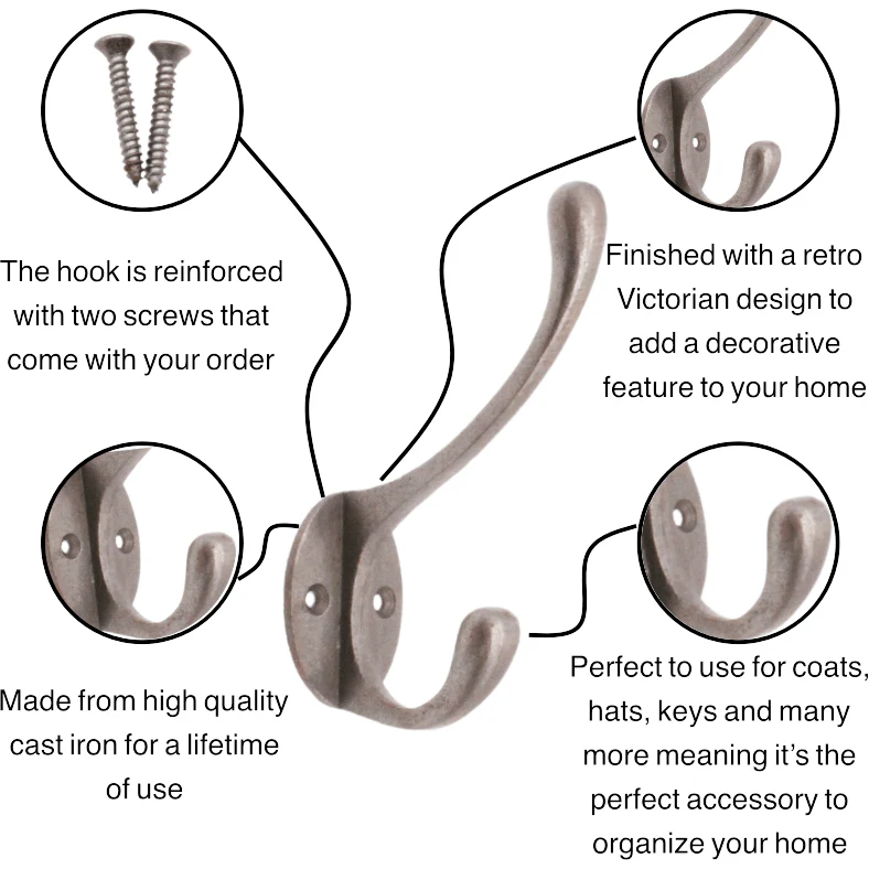 Our Cast Iron coat hooks are perfect for many different purposes such as hanging coats, hats, keys and many more making this ideal for organising your home. They are made out of cast iron making these very strong and durable being able to hold up to 15kg of weight. It is reinforced with two screws that come with your order for easy installation.