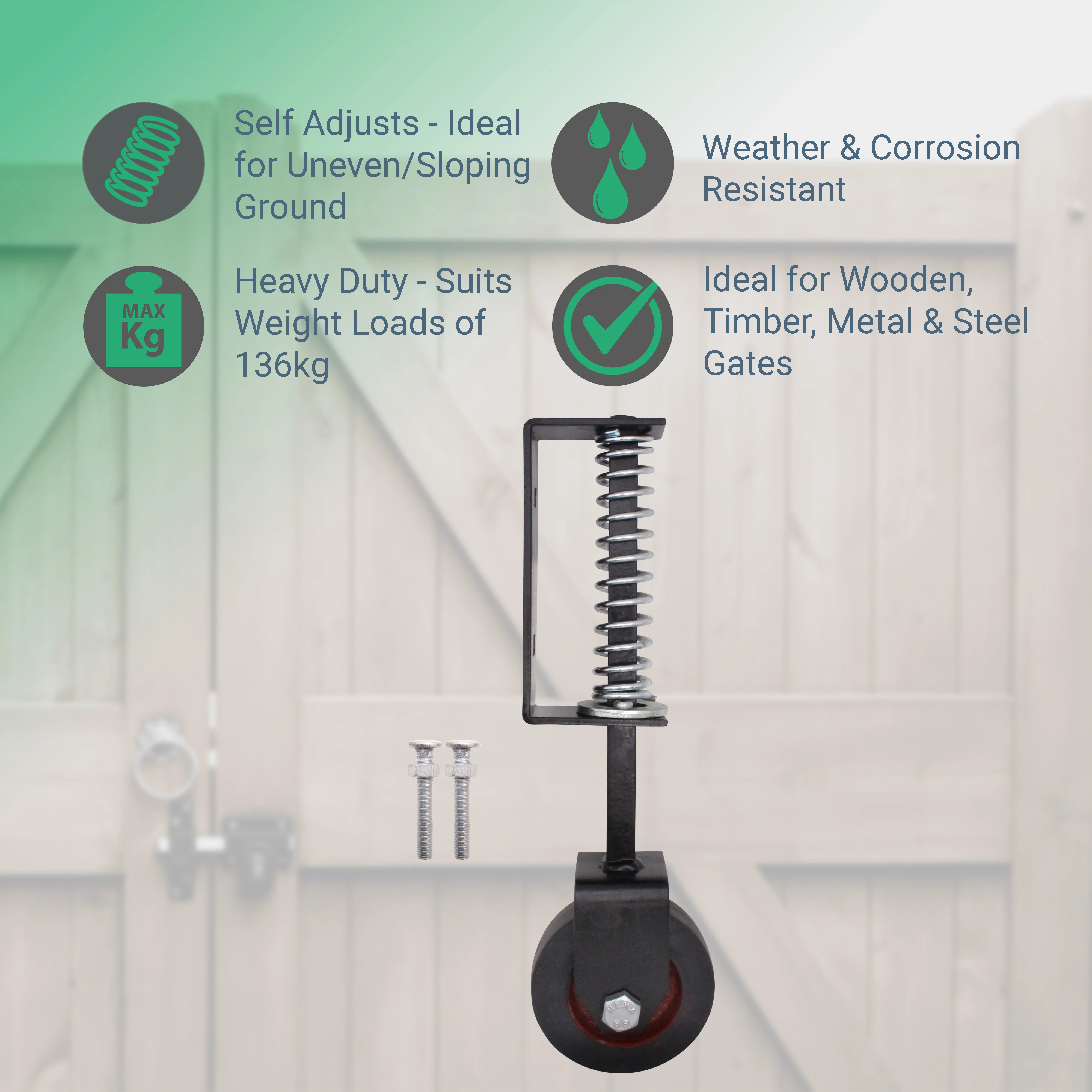 - Includes 1 x heavy duty gate wheel, 1 x fixing pack and all fixings in matching finish