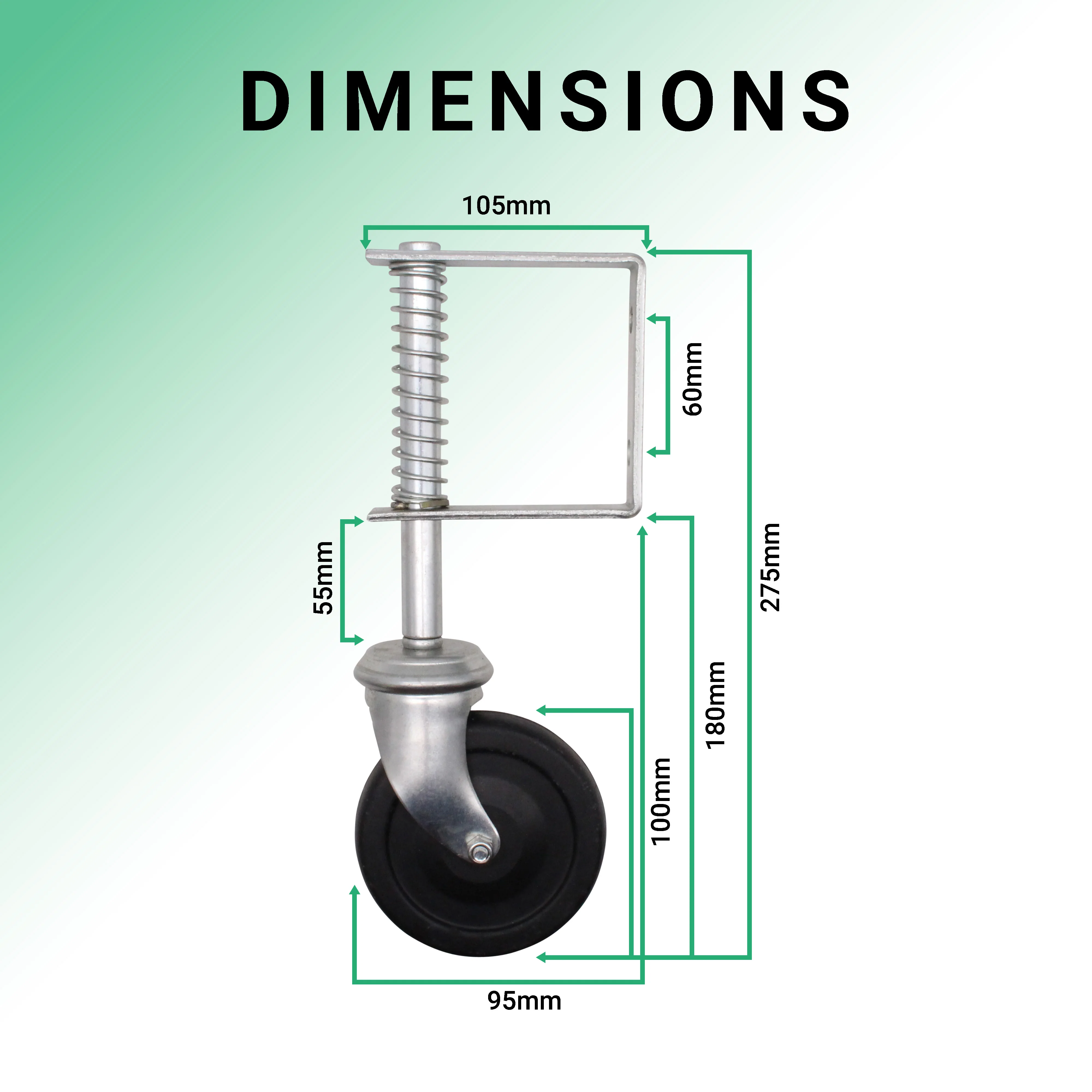 - Spring loaded wheel caster to cater for bumpy or sloping ground