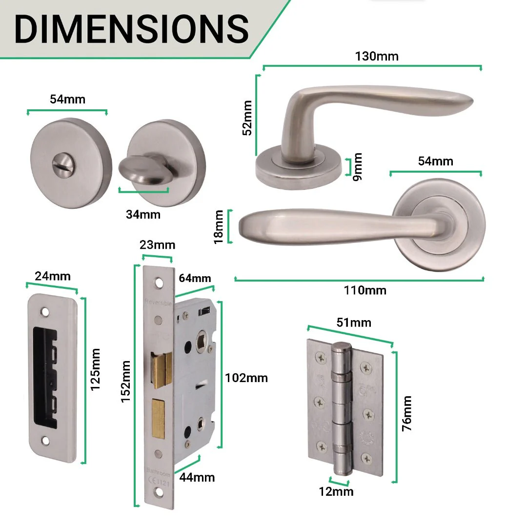 Complete door pack that includes 1 x pair Sassari nickel door handles, 1 x turn & release, 1 x bathroom lock (64mm size/44mm backset) and 2 x matching fire rated 76mm door hinges (code: HSTB76SNP)